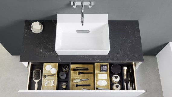 Das Schubladenkonzept wurde von Geberit mit viel Liebe zum Detail erarbeitet. Das Ergebnis kann sich sehen lassen: Hochwertige und leicht wirkende Schubladen ohne Schrägen und ohne sperrige Seitenführung, die eine maximale Ausnutzung des verfügbaren Stauraums ermöglichen. Für den Siphon des Waschtisches ist zudem keine Aussparung mehr nötig. Dadurch gewinnt die Schublade in der Schubladenmitte mehr Tiefe und damit mehr Stauraum. Optional können auch integrierbare Lichtleisten gewählt werden, die für mehr Helligkeit und eine edle Optik in der Schublade sorgen. Wahlweise steht zusätzlich ein sehr hochwertiges modulares Organisationssystem für mehr Ordnung in der Schublade zur Verfügung.