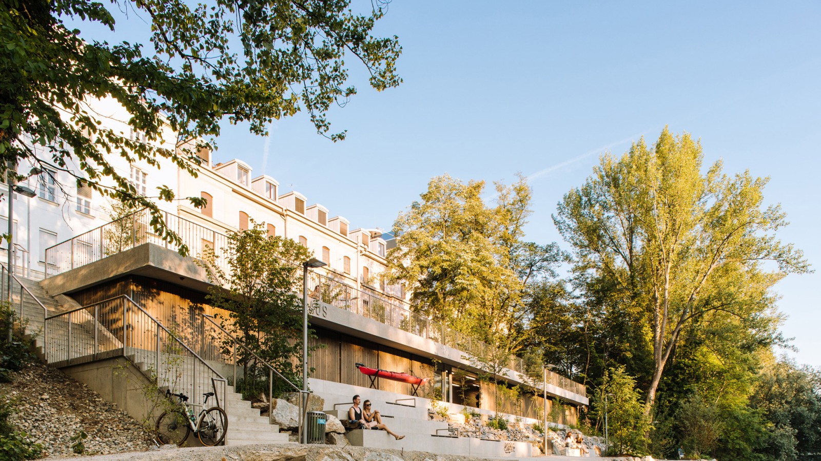 Ob entlang des Flussufers oder auf dem Wasser im Kajak: Das Stadtbootshaus Graz im Süden Österreichs verbindet Erholung und Bewegung gleichermassen. Eingebettet in die Hanglandschaft am Ufer der Mur, steht seit 2022 die neue Wassersportanlage. Passanten können vom begehbaren Gebäudedach die sportlichen Aktivitäten am Wasser verfolgen und direkt auf den Marburger Kai blicken.